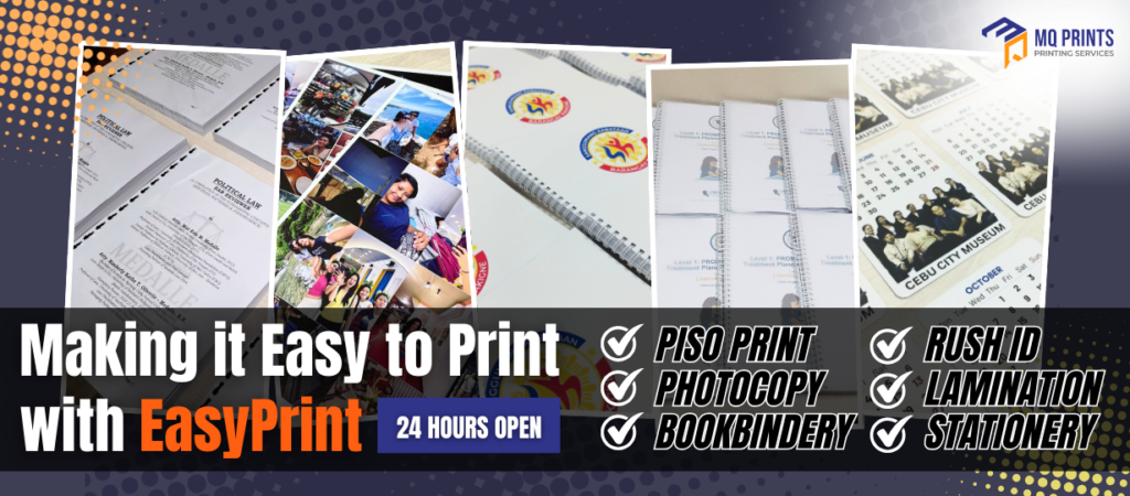 Created by MQ Prints based in Cebu City, is a reliable and innovative printing solution of MQ Printing Services serving companies and institutions across the Philippines. EasyPrint offers high-quality piso-print, photocopy, bookbindery, rush ID, lamination, and stationery.